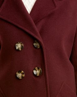 - Brushed Wool-Blend Peacoat In Wine With Angled Front Patch Pockets And Center Vent At Back Hem