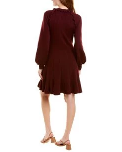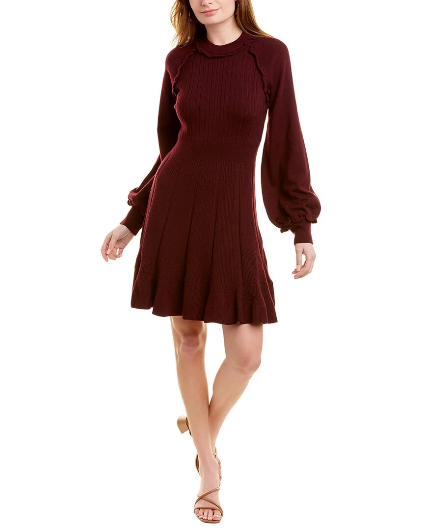 - Ruffle Wool-Blend Sweater In Wine With Ribbed Detailing And Balloon Sleeves