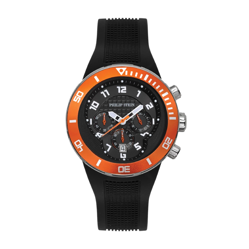 Designed as the perfect all-occasion timepiece, each Philip Stein watch in the Active Collection lends itself to on-the-go lifestyles. Inspired by athletes, these timepieces feature sleek design and high quality craftsmanship, plus Natural Frequency Technology that will help you enjoy less stress and more energy. For those looking to add a touch of color to their wardrobe, this striking Philip Stein Extreme Chronograph quartz movement watch in black features a bold orange case and white dial accents that pop.